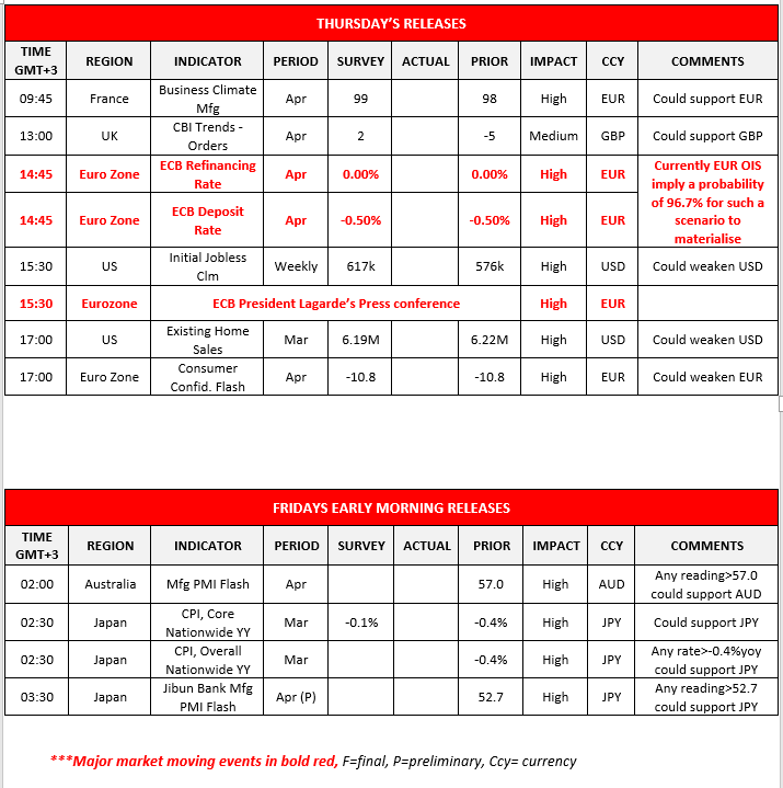 ECB is widely expected to remain on hold (11:45, GMT), keeping the refinancing rate at 0.0% and the deposit rate at -0.50% and EUR OIS imply a probability of 96.7% for such a scenario to materialize, while the release is to be followed by Lagarde’s press conference (12:30,GMT) . Despite Lagarde’s statements that the area is to experience a very fast recovery in the second half of the year, chances are that the economy will reach prepandemic levels in the coming year. It’s characteristic that she compared the Zone’s economy to a patient that is still on two crutches and in need of support for some time. That allows for little optimism in today’s ECB meeting and the tone is expected to be tilted to the dovish side. The event is expected to result in very little changes for the bank’s monetary policy statement. Overall, we see the risks related to the event as tilted to the downside for the common currency at the time.