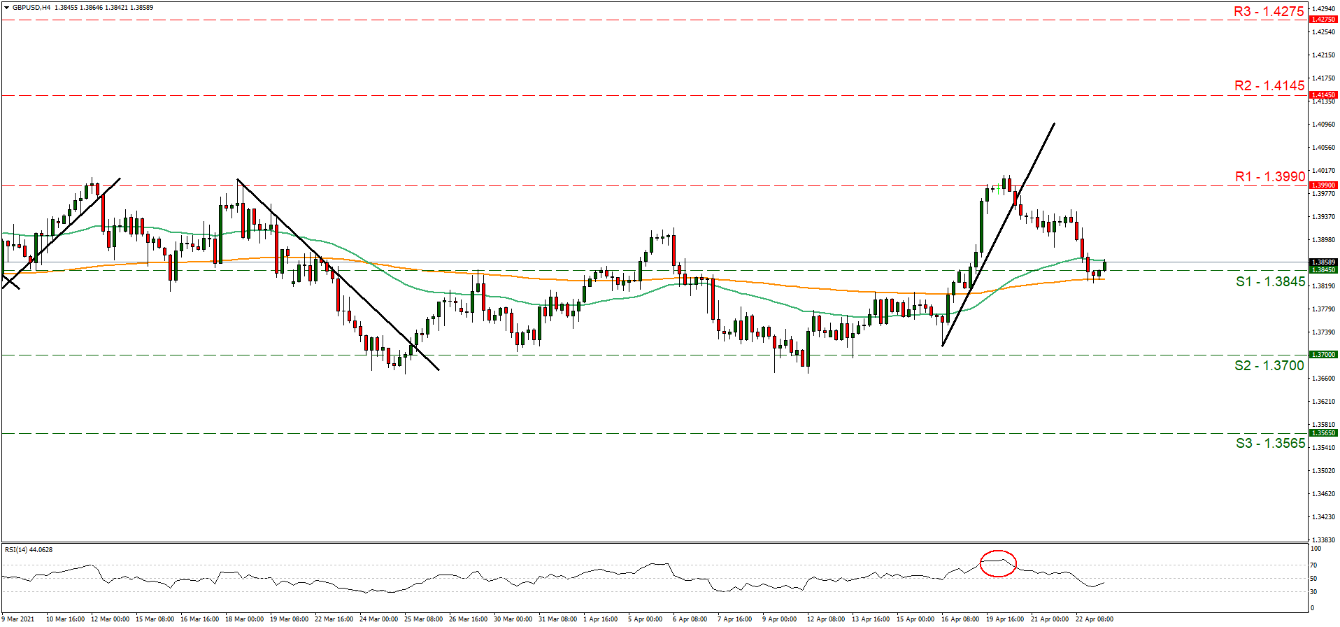 The pound dropped against the USD, EUR and JPY yesterday practically erasing a substantial portion of the gains made in the week. Fundamentally the UK outlook is supported by an intense vaccination program and an early reopening of the economy as a result of it, which could provide a boost in economic activity, especially in the services sector, as UK’s HORECA sector opened. It should be noted that UK manufacturers’ expectations for a rebound of the economy rose substantially in April yet at the same time the CBI trends for orders indicator dropped for April instead of rising as expected. We expect pound traders to focus on the release of UK’s retail sales growth rate for March as well as the preliminary PMI figures for April especially for the services sector. GBP/USD dropped yesterday yet seems to have found support at the 1.3845 (S1) support line during today’s Asian session. We maintain our bias for a sideways movement for the time being, yet the bears may be just around the corner for the pair, given that RSI indicator below our 4-hour chart is between the reading of 50 and 30. Should the bears actually take charge of pair’s direction, we may see cable breaking the 1.3845 (S1) support line and aim for the 1.3700 (S2) support level which was able to resist the downward pressure by the pair on the 24th of March and the 12th of April . Should the bulls be in charge of GBP/USD’s direction on the other hand, we may see the pair aiming for the 1.3990 (R1) resistance line, which capped the pair’s upward movement on the 12th of March, the 18th of March and the 20th of April, overall proving its worth and drawing the notice of traders to it.
