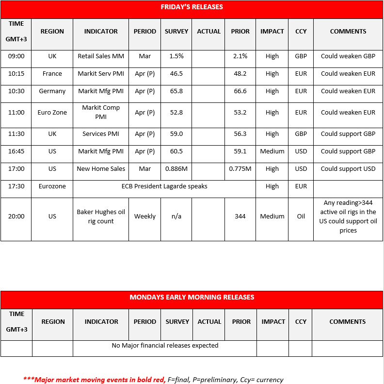 Today during the European session, we note the release of UK’s retail sales growth rate for March as well as France’s, Germany’s, Eurozone’s and the UK’s preliminary PMI readings for April. In the American session, we get the US Preliminary PMI readings for April, the New Home sales figure for March, while oil traders may be more interested in the weekly US Baker Hughes oil rig count. On the monetary front, we highlight ECB President Christine Lagarde’s speech in the AS.