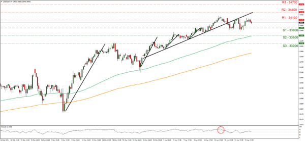 Dow Jones remained relatively stable yesterday testing the 34100 (R1) resistance line. We tend to maintain a bias for a sideways motion and for it to change towards either direction we would require the index’s price action to break clearly either the 34100 (R1) resistance line or the 33800 (S1) support line. Please note that the RSI reading, just below our 4-hour chart, remains near the reading of 50 and could be implying a rather indecisive market. Should the bulls take charge over the index’s direction, we may see it breaking the 34100 (R1) resistance line and aim for the 34400 (R2) resistance level, which would be a new record high for the index. Should the bears take over, we may see the index breaking the 33800 (S1) support line and aim for the 33500 (S2) support level.