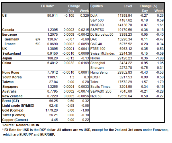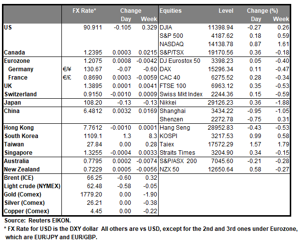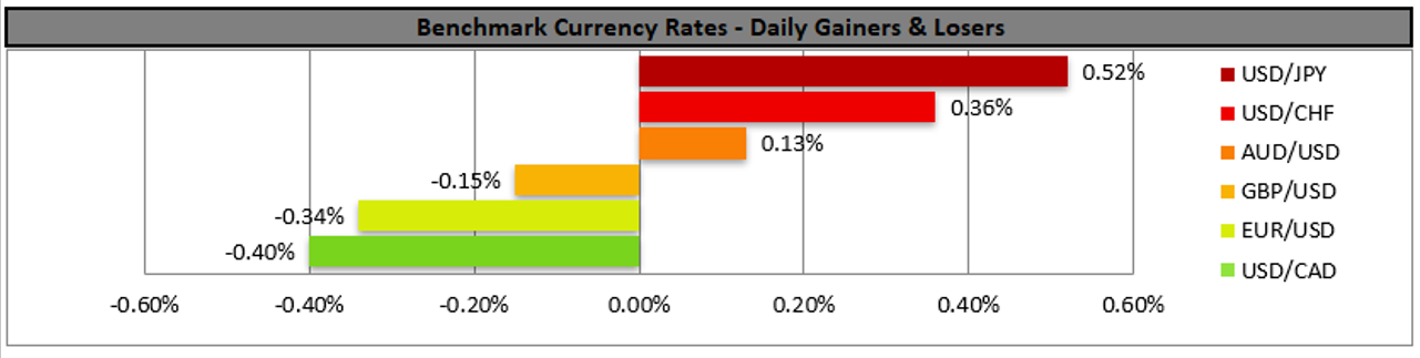 As was widely expected BoJ remained on hold maintaining rates at -0.10% at its interest rate decision during today’s Asian session and generally failed to impress traders as JPY and Japanese stocks tended to remain relatively quiet. In its accompanying statement the bank maintained its dovishness and stated that it will monitor the effects of the pandemic on the Japanese economy and that it will not hesitate to take additional easing measures if necessary. In its Outlook BoJ seemed to be more upbeat, yet highlighted that risks to the economic outlook are skewed to the downside for the time being. We continue to see safe haven flows as being the main driver for JPY, especially given the low number of high impact financial releases from Japan.