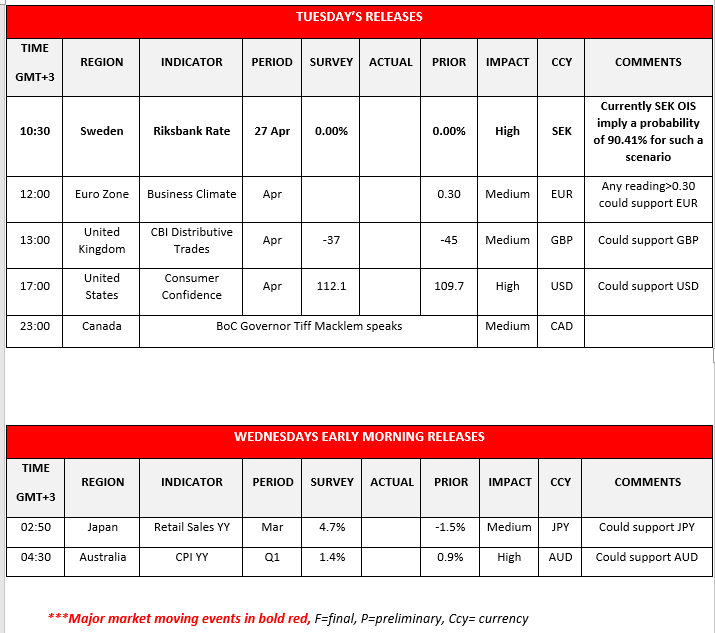 Today during the European session, we get from Sweden Riksbank’s interest rate decision. The bank is widely expected to remain on hold at 0.0%. Overall, we expect the bank to maintain its cautiousness until the recovery is well under way and the pandemic related uncertainty retreats considerably yet should the bank allow for some optimism to prevail, we may see SEK strengthening. Also, we note from the UK the CBI distributive trades for April and the US consumer confidence for April in the American session. Please note that during the American session, BoC Governor Tiff Maclem is scheduled to speak, while. During Monday’s Asian session, we get from Australia the CPI rates for Q1.