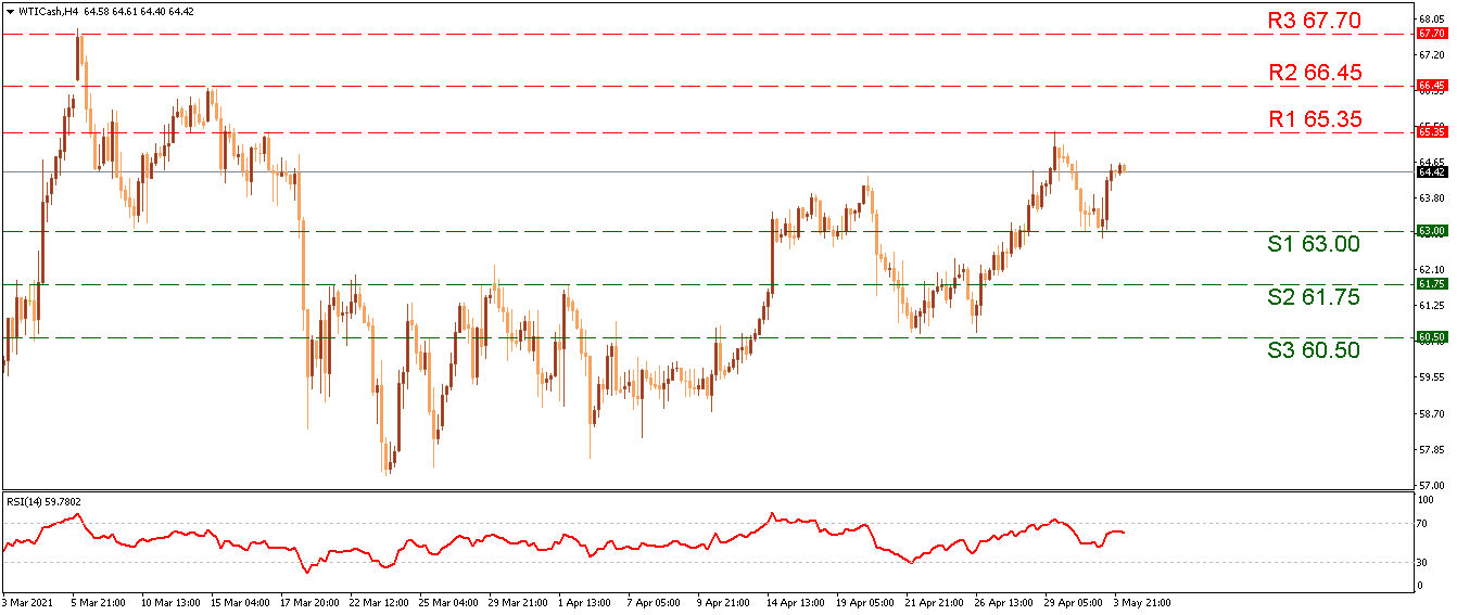 On Monday WTI bounced off the (S1) 63.00 support level and headed higher surpassing $64. If the buying trend continues to dominate the commodity’s price action then we may see a run higher to the (R1) 65.35 resistance level. This level was briefly tested last time in the past week thus remains very relative to recent price action. Higher we have noted the (R2) 66.45 resistance level that was last tested in March while even higher the (R3) 67.70 resistance line represents the highest price reached in 2021. In the opposite direction, as noted our first support is at the (S1) 63.00 while even lower the (S2) 61.75 support level could be the next stop in a downward trend line. Our lowest level for this report remains the (S3) 60.50 support level that was tested twice in April but was not breached to the downside. At the moment the RSI indicator remains above 50 which could imply the buying orders are still in excess.