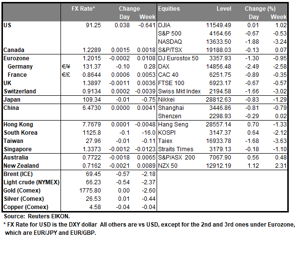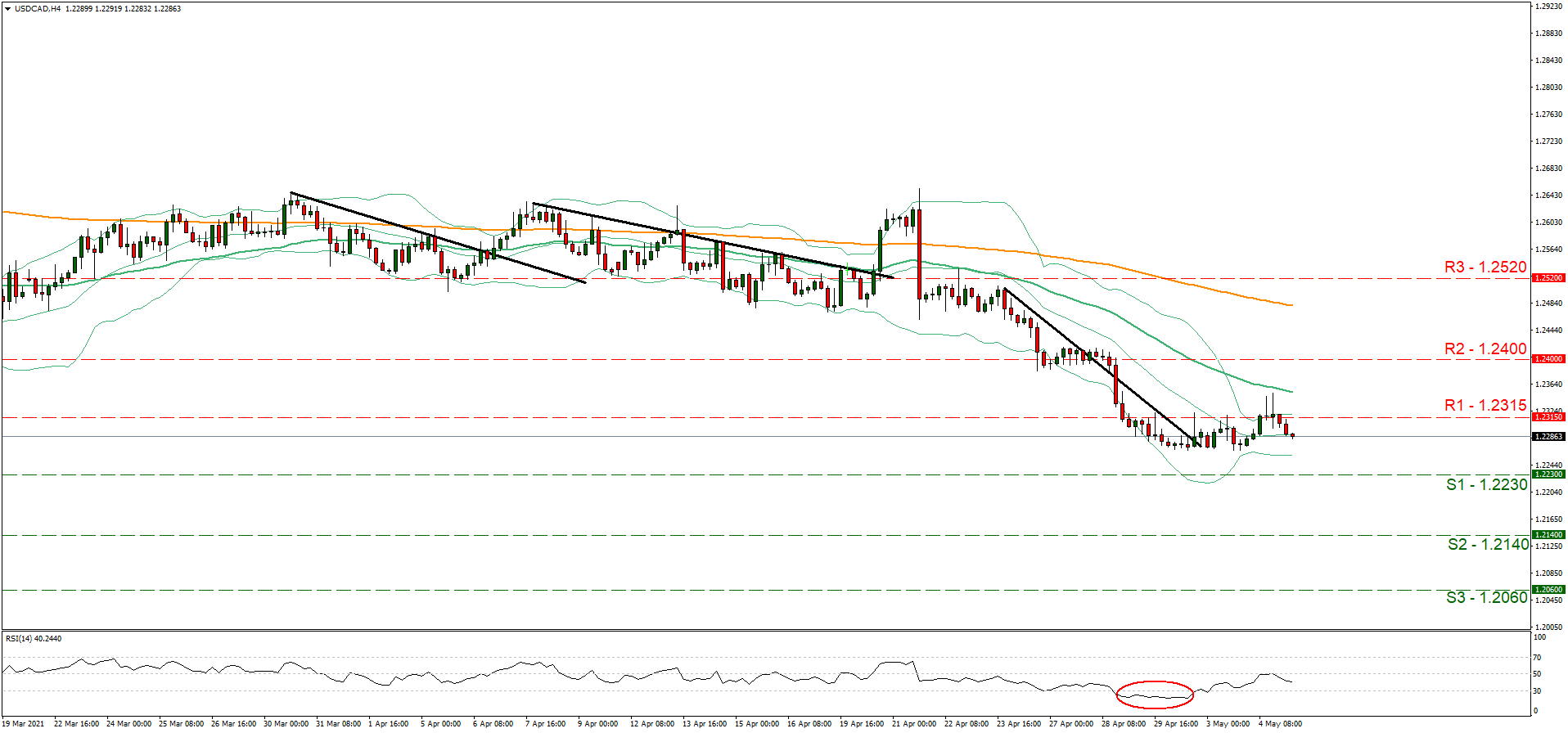 USD/CAD remained relatively stable yesterday and despite some bullish tendencies landed between the 1.2315 (R1) resistance line and the 1.2230 (S1) support level. We tend to maintain a bias for a sideways movement currently for the pair, as it remained between the two prementioned levels, since breaking the downward trendline characterising its movement. On the other hand, it should be noted that the RSI indicator below our 4-hour chart is between the readings of 50 and 30, providing a slight advantage for the bears. Should a selling interest be actually displayed by the market, we may see the pair breaking the 1.2230 (S1) support line and aim for the 1.2140 (S2) support level. Should on the other hand the pair find extensive buying orders along its path we may see it breaking the 1.2315 (R1) resistance line clearly and aim for the 1.2400 (R2) resistance level.