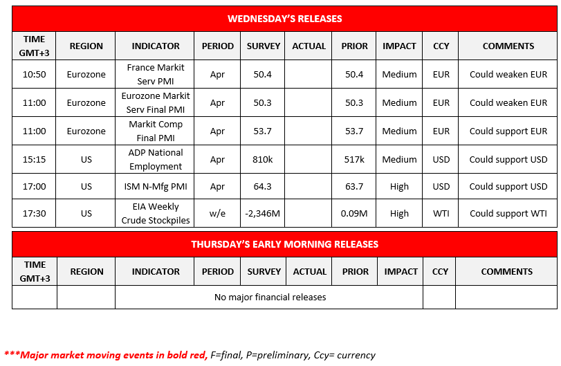 Today we note the final PMI readings for April concerning France and the Eurozone during the European session, while in the American session, we note the US ISM non-manufacturing PMI for April as well as the ADP National employment figure for April and the weekly EIA crude oil inventories figure. Also note that a number of Fed officials speak today.