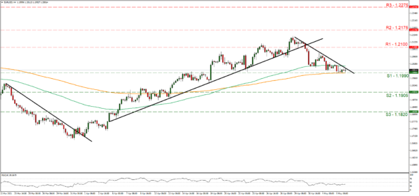 EUR/USD continued to have some bearish tendencies yet finds considerable support at the 1.1990 (S1) support line. For our current bearish outlook to change for a sideways movement bias, we would require the pair to clearly break the downward trendline characterizing the pair’s movement since the 29th of April. Should the market display a selling interest for the pair, we may see EUR/USD breaking the 1.1990 (S1) support line and aim for the 1.1905 (S2) support level. Should buyers have the advantage over the pair’s direction, we may see the pair aiming if not breaking the 1.2100 (R1) resistance line.
