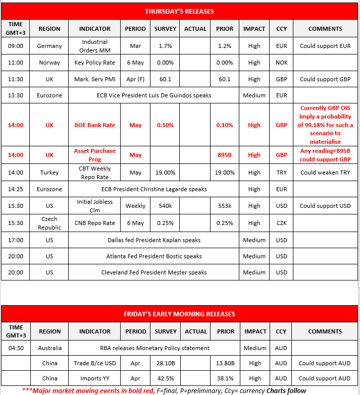 The pound remained relatively steady against the USD yesterday ahead of BoE’s interest rate decision and elections in Scotland, both today. BoE is widely expected to remain on hold keeping rates at 0.10% and currently GBP OIS imply a probability for such a scenario at 99.18%. Given the swift recovery of the UK economy after its reopening, especially in the services sector since mid-April, we may see the confidence of the bank getting a boost and in such a case the bank may slowdown the purchases of assets as the economy rebounds. Such a development could provide support for the GBP if also accompanied by more confidence while if the bank fails to meet the market’s expectations, we may see GBP weakening. Also on the pound’s fundamentals, we note the local elections taking place today, with special focus being on Scotland and should pro-independence parties win we may see the Scots asking for a second independence referendum. Please note that Johnson’s government had experienced considerable negative press headlines in the recent past and should it have an adverse effect in the election results, we may see the pound weakening.