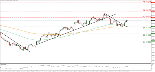 EUR/USD bounced on the 1.1990 (S1) support line, which held its ground and aimed for the 1.2100 (R1) resistance line. As the pair in its upward motion broke the downward trendline guiding its price action since the 29th of April, we switch our bearish outlook in favour of a sideways movement bias initially. Please note that the RSI indicator below our 4-hour chart was able to surpass the reading of 50 and seems to have stabilised somewhat, providing a slight advantage for the bulls. Should the bulls actually take charge over the pair’s direction, we may see EUR/USD breaking the 1.2100 (R1) resistance line and aim for the 1.2175 (R2) resistance level. Should the bears regain control over EUR/USD, we may see the pair breaking the 1.1990 (S1) support line and aim for the 1.1905 (S2) support level.
