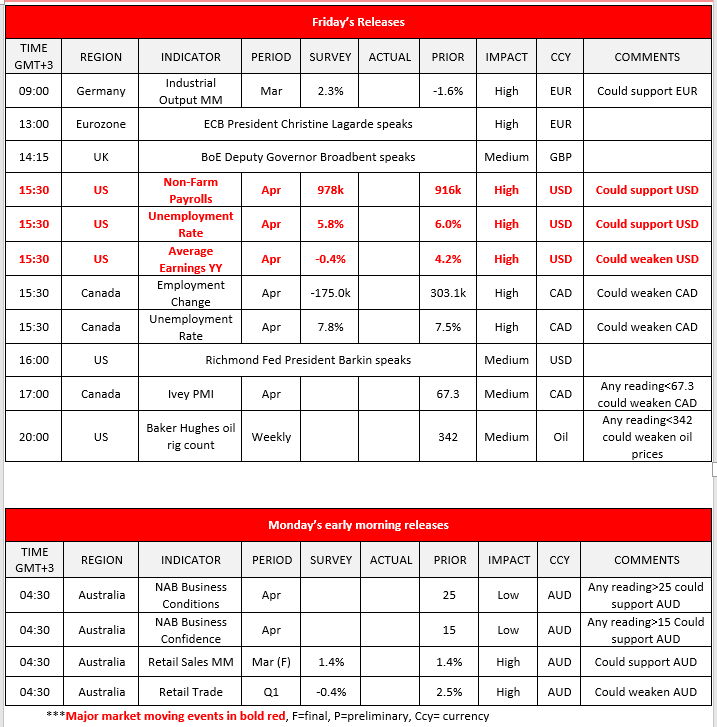 Besides the US and Canadian employment market data for April, we would note also the final rate of Australia’s retail sales for March. On the monetary front, we would note that ECB President Lagarde, BoE Deputy Governor Broadbent and Richmond Fed President Barkin are scheduled to speak. Calendar follows