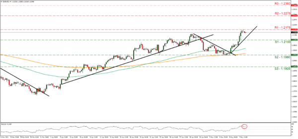 Starting with EUR/USD, the currency pair rose on Friday breaking the 1.2100 (S1) resistance line, now turned to support, yet during the Asian session seems to have found considerable resistance at the 1.2175 (R1) resistance line and stabilised during the Asian session today. We tend to maintain a bullish outlook for the pair as long as it remains above the upward trendline incepted since the 6th of May. Please note that the RSI indicator below our 4-hour chart remained just above the reading of 70 and may be implying that the pair is overbought, so a correction lower is possible. Should the bulls maintain control over the pair, we may see EUR/USD breaking the 1.2175 (R1) resistance line and aim for the 1.2275 (R2) resistance level. Should the bears take over, we may see the pair aiming if not breaking the 1.2100 (S1) support line.