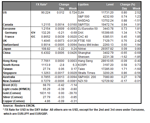 Moving now to commodity currency pairs and specifically AUD/USD, the pair rose on Friday, even steeper than other pairs breaking the 0.7785 (S1) resistance line, now turned to support and reached a new 2 ½ month high by testing the 0.7850 (R1) resistance level. We maintain a bullish outlook for the pair as long as it remains above the upward trendline incepted since the 6th of May. Please note that the RSI indicator below our 4-hour chart remained just above the reading of 70 and may be implying that the pair is overbought, so a correction lower is possible. If AUD/USD finds fresh buying orders along its path, we may see the pair breaking the 0.7850 (R1) resistance line and aim for the 0.7905 (R2) resistance level. Should a selling interest be displayed we may see AUD/USD aiming if not breaking the 0.7785 (S1) support line.