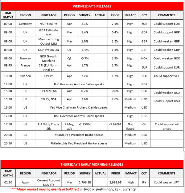 USD remained at rather low levels yesterday yet stabilized and even had some small gains against its counterparts yesterday. The market is still focused on the Fed’s intentions and whether it plans to tighten its monetary policy through its asset purchases program mainly and April’s US inflation rates which are due out later today are in the epicenter of the market’s attention. For the time being the Fed seems to stick to its ultra loose monetary policy and its characteristic that Fed Governor Brainard stated yesterday that weak labour data released last week for April, show that the recovery has a long way to run. Yet should inflation rates accelerate more than forecasted, especially on a year on year level, we may see the USD getting some support as the pressure on the Fed could increase. Also note that things weren’t so rosy in the US equities markets, given that Dow Jones tumbled, while in the FX market the effect seems to be bigger on commodity currencies such as AUD.