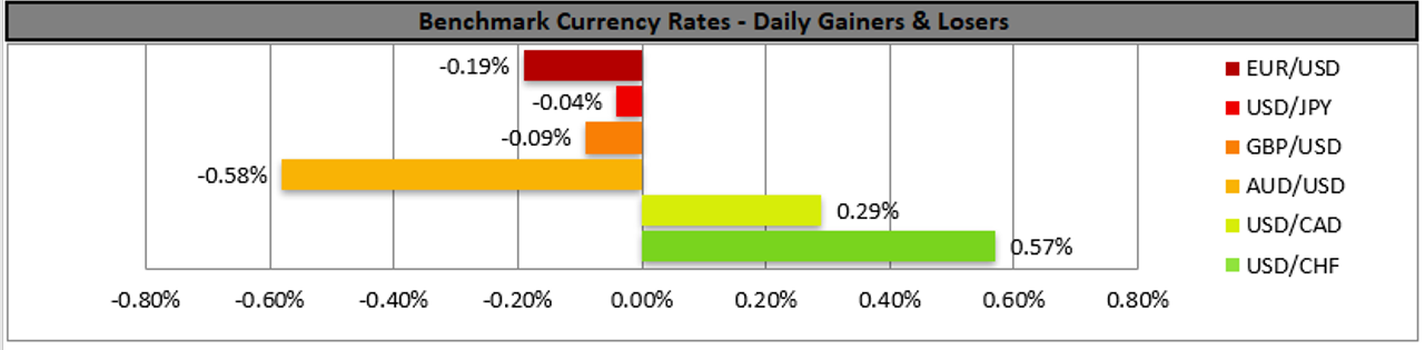 AUD/USD dropped from the highs of the 0.7850 (R1) resistance line and aimed for the 0.7785 (S1) support level, which was tested during today’s Asian session. We tend to maintain a bias for a sideways motion currently between the prementioned levels, yet bears seem to have a slight advantage, given that the RSI indicator below our 4-hour chart has a downward slope. Should the bears actually maintain control over the pair we may see AUD/USD breaking the 0.7785 (S1) support line and aim for the 0.7725 (S2) support level. Should the bulls take over, we may see the pair aiming for the 0.7850 (R1) resistance line and aim for the 0.7950 (R2) level.