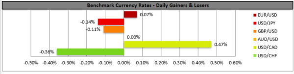 GBP/USD maintain a relatively sideways motion yesterday despite some bearish tendencies midday and remained well between the 1.4145 (R1) and the 1.3990 (S1) levels. Given the pair’s movement yesterday we tend to maintain our bias for a sideways motion and for it to change we would require a clear breaking of either of the prementioned levels. Also please note that the RSI indicator below the 4-hour chart, runs smoothly along the reading of 50, strengthening the notion of a rather indecisive market. Nevertheless, should cable find fresh buying orders along its path, we may see the pair breaking the 1.4145 (R1) resistance line and aim for the 1.4275 (R2) resistance level. Should a selling interest be displayed by the market for GBP/USD, we may see the pair breaking the 1.3990 (S1) support line and aim for the 1.3845 (S2) level.