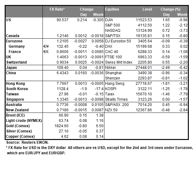 The USD index maintain a tight rangebound movement yesterday, hovering just below the 90.75 (R1) resistance line. We tend to maintain a bias for a sideways motion today, given the index’s movement yesterday, yet we note that the RSI indicator below the our 4-hour chart is just above the reading of 50, yet forms a downward slope. Should the bears take the lead over the index’s direction, we may see it aiming if not breaking the 90.25 (S1) support line, on its journey southwards. On the flip side, should the bulls take over, we may see the index breaking the 90.75 (R1) resistance line and aim for the 91.30 (R2) level.
