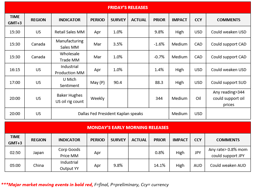 Today in the American session we highlight the release from the US of the retail sales and industrial output growth rates both for April as well as the preliminary University of Michigan consumer sentiment for May, while from Canada we get the manufacturing sales for and wholesale trade growth rates for March. Please note that on the monetary front, Dallas Fed President Kaplan is scheduled to speak while oil traders may also be interest in the release of the weekly US Baker Hughes oil rig count. During Monday’s Asian session, we note the release of Japan’s corporate goods prices for April, while Aussie traders may be more interested in the release of China’s industrial output growth rate for April.