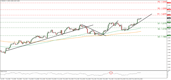 EUR/USD rose yesterday especially during the European session, breaking the 1.2175 (S1) resistance line, now turned to support. We tend to maintain a bullish outlook for the pair as long as it remains above the upward trend line incepted since the 14th of May. Please note though that the RSI indicator below our 4-hour chart has surpassed the reading of 70, which on the one hand confirms the bull’s dominance, yet on the other may imply that the pair is overbought, and a correction lower is possible. Should the bulls maintain control over the pair’s direction, we may see EUR/USD breaking the 1.2275 (R1) resistance line and aim for the 1.2350 (R2) resistance level. Should the bears take over, we may see the pair reversing its course, breaking the prementioned upward trendline the 1.2175 (S1) support line and aim for the 1.2100 (S2) support level.