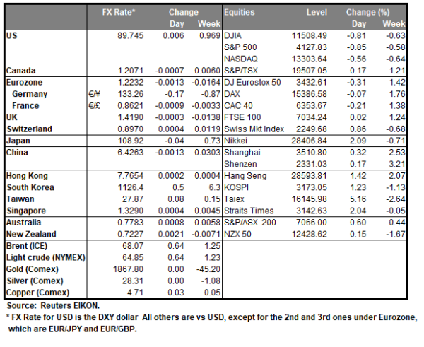 The greenback weakened against a number of its counterparts yesterday and retreated against EUR, CHF and GBP as the market maintains its expectations for US interest rates to remain at rather low levels for some time. Market attention today turns to the release of the Fed’s April 27-28 meeting minutes which are expected to reaffirm the view that the bank is still a long way from a possible rate hike. We would not be surprised to see the bank recognising the progress being made in the US economic recovery and the inflationary pressures, yet may characterise the latter as temporary, rejecting market pressure to act. Given the lack of high impact US financial releases, we expect monetary issues along with fundamentals to be the main drivers for the market sentiment.