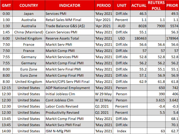 As for today, the spotlight will fall on the ISM non-manufacturing PMI. Markets will pay close attention to how inflationary pressures are evolving and how the labor market is doing, ahead of the nonfarm payrolls report tomorrow. Similarly, the ADP jobs report today will give us more clues around the employment situation, even though the correlation with NFP is rather weak.