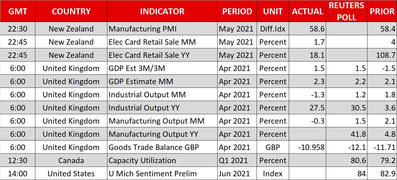 The pound has also been edging sideways throughout June and there was little reaction to today’s data showing UK GDP exploded by a record 27.6% year-on-year in April as the economy reopened. Rising concerns about rising virus infections in the UK, as well as an ongoing spat with the European Union over customs checks with Northern Ireland are a bit of a drag on sterling at the moment.