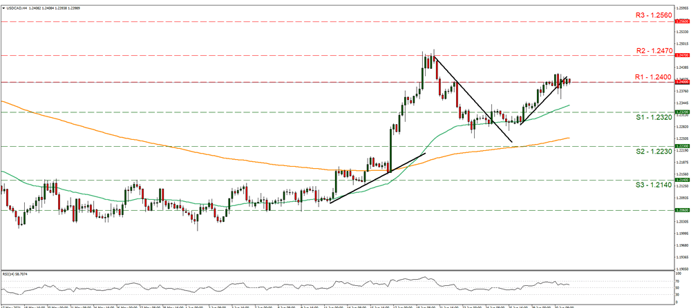 USD/CAD seems to have stabilised as its price action revolves around the 1.2400 (R1) level. We tend to maintain a bias for a sideways motion given that the pair has broken the upward trendline guiding it since the 28th of June. On the other hand, the RSI indicator below our 4-hour chart is above the reading of 50 implying that the bulls may have a slight advantage. Should the pair find fresh buying orders along its path we may see the pair breaking the 1.2400 (R1) resistance line and aim for the 1.2470 (R2) resistance level. Should a selling interest be displayed by the market, we may see the pair aiming if not breaking the 1.2320 (S1) support line.