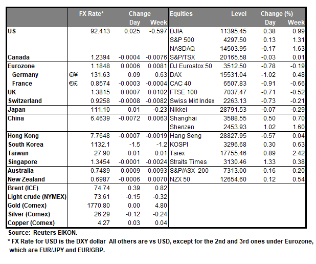 The USD tended to gain against a wide range of its counterparts, with the effect being amplified against safe havens JPY and CHF, ahead of the key US Employment report due out tomorrow that could affect the Fed’s monetary stance. Traders are looking to tomorrow’s US non-farm payrolls report for signs on whether the US employment market is tightening or not and recent polls by Reuters expect a gain of 700k jobs created last month and the unemployment rate to tick down to 5.7%. On the other hand, safe haven assets such as Treasuries, the greenback and the Yen seem to remain in demand given the fast spreading of the Delta variant of COVID-19, which could slow down the economic recovery on a global level. Countries such as Indonesia, Malaysia, Thailand and Australia are reported to be struggling with the pandemic while a number of European countries have announced quarantine measures for British subjects. Today’s attention is expected to turn to the US financial releases especially the weekly initial jobless claims and the ISM manufacturing PMI for June.