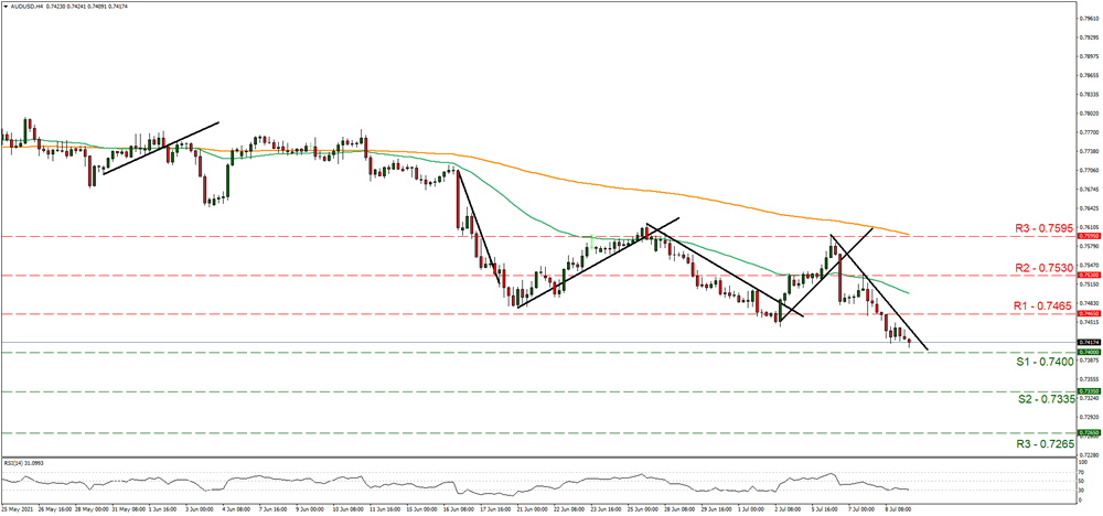 AUD/USD also dropped breaking the 0.7465 (R1) support line, now turned to resistance and is currently aiming for the 0.7400 (S1) support level. We tend to maintain a bearish outlook for the pair as long as it remains below the downward trendline formed since the 6th of July. It should be noted that the RSI indicator below our 4-hour chart has reached the reading of 30 as result of the intense selling interest of the market, yet at the same time may imply that he pair is oversold and a correction higher is possible. Should the selling interest of the market be extended we may see the pair breaking the 0.7400 (S1) support line and aim for the 0.7335 (S2) support level. Should buyers take charge of the pair’s direction, we may see AUD/USD breaking the prementioned downward trendline and aim, if not break the 0.7465 (R1) resistance line.