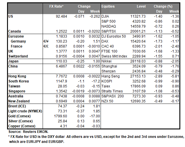 Safe-havens such as JPY and CHF gained yesterday, while riskier assets which include currencies such as the Aussie and the Kiwi suffered remaining near multi-month lows as the market worries for the economic recovery on a global level tended to increase. On the flip side US stockmarkets tended to retreat as Dow Jones, S&P 500 and Nasdaq dropped, displaying the risk aversion of the market. As was expected bonds rallied and equities world-wide dropped as the fast-spreading Delta variant of COVID-19 endangers the economic recovery highlighting weaknesses with various soft spots being on display. It’s characteristic that the initial Jobless claims figure for last week rose instead of dropping as expected, reaching 373k last week, increasing worries about the tightening of the US employment market. We expect fundamentals to be the key drivers for the greenback today as high impact financial releases seem to be absent from the US.