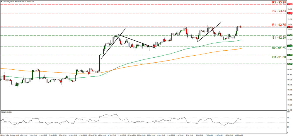 The greenback got considerable support yesterday against a number of its counterparts as the US inflation rates accelerated beyond market expectations and its characteristic that the headline CPI rate year on year reached a level not seen since August 2013. The acceleration of the US inflation rates increased expectations for the Fed to tighten its monetary policy rather sooner than later. The market’s attention now turns to Fed Chair Powell’s testimony before Congress today and tomorrow for any signals on the timing of a tapering of stimulus and higher interest rates. Should Powell stress the need for patience in the face of accelerating inflation we may see the USD losing steam and weakening while should the Fed’s Chairman recognize or signal the need for an earlier tightening of the bank’s monetary policy, we may see the USD gaining further. The USD Index rose yesterday breaking the 92.30 (S1) resistance line, now turned to support, and continued higher yet seems to have reached a ceiling for now at the 92.75 (R1) resistance level. Given the index’s relative stabilisation during the Asian session today we may see it maintaining a sideways motion and for it to change for a bullish outlook we would require a clear breaking of the 92.75 (R1) resistance line. Please note that the RSI indicator below our 4-hour chart is between the readings of 50 and 70, implying an advantage for the bulls, yet Powell’s speech later today could affect the Index to either direction. Should the bull’s actually take over we may see the index breaking the 92.75 (R1) resistance line and aim for the 93.45 (R2) level. Should the bears prevail, we may see index breaking the 92.30 (S1) support line and aim for lower grounds.