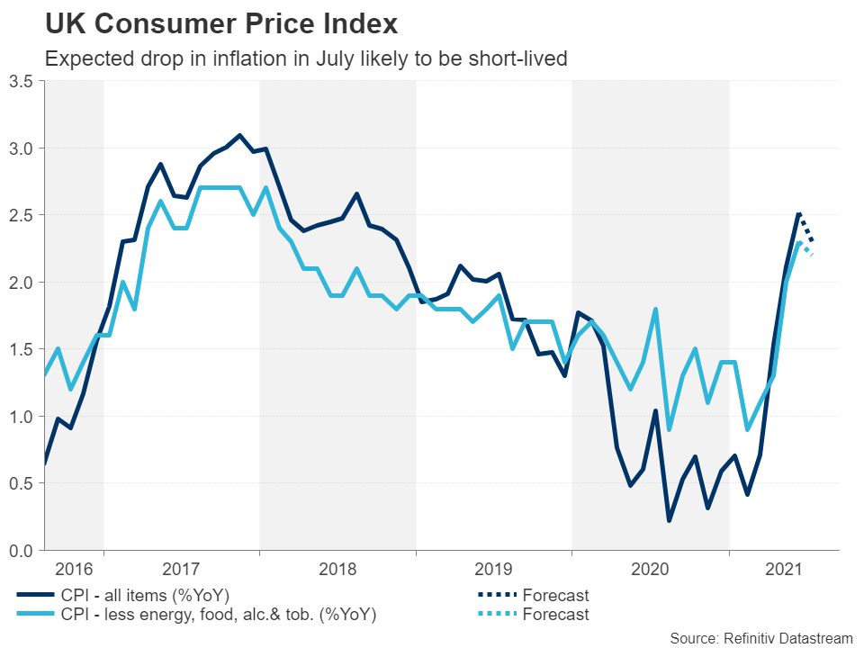The UK isn’t quite experiencing runaway inflation like in the United States, but the Bank of England is already nervous that its forecasters are predicting the consumer price index will hit 4% later this year. In June, the annual rate of CPI stood at 2.5% – above the Bank’s 2% target. It is expected to have moderated slightly to 2.3% in July before potentially picking up again. The core rate is also forecast to have eased back a little in July to 2.2% from 2.3%.