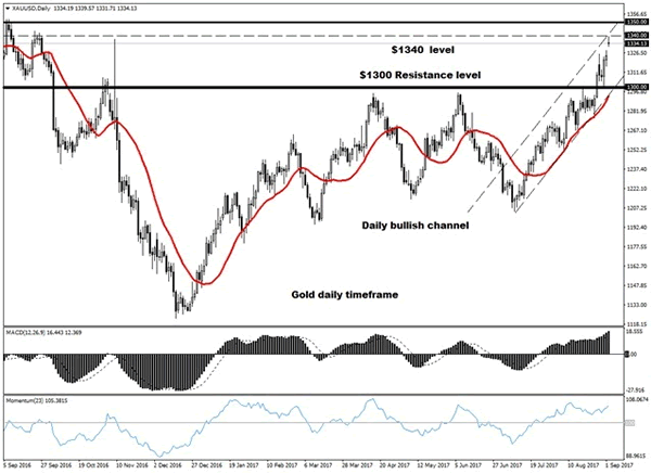Gold sprinted to a fresh 12-month high above $1339.50 during Monday’s trading session, as escalating geopolitical tensions between the US and North Korea prompted investors to rush to safe-haven assets. The disappointing US employment data released on Friday has also complimented the metal’s upside, with investors now reevaluating whether the Federal Reserve will raise rates a third time this year.