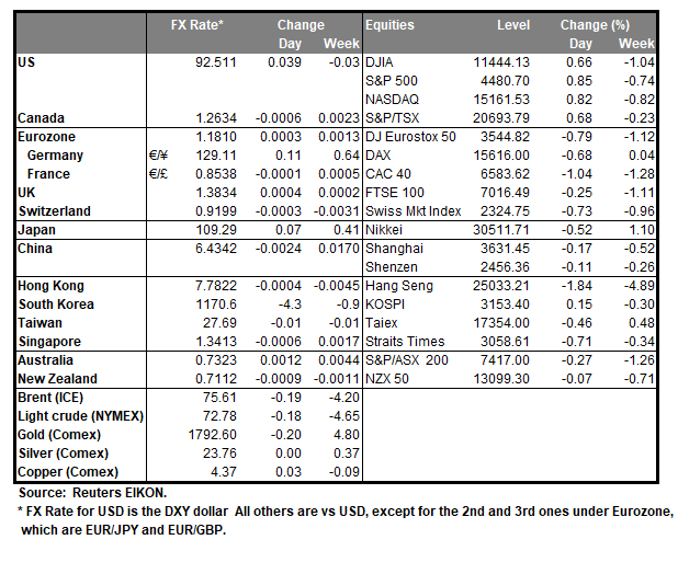The greenback remained relatively stable yesterday against a number of its counterparts, as the market’s attention shifts to the FOMC’s interest rate decision next week which could provide further clues regarding the bank’s intentions on tapering its stimulus. US stockmarkets on the other hand, gained a bit as investors seem to overcome somewhat their worries about the prospects of the US economy’s recovery, yet the movement was still unconvincing. Gold edged a bit lower, yet overall, the precious metal seems to maintain a sideways movement also driven by USD’s inactivity and given that US yields remained little changed over the day. Today we may see traders keeping an eye out for the US financial releases as at the same time we get the weekly initial jobless claims figure, the Philly Fed Business index for September and the US retail sales for August, covering the fields of employment, consumption, and manufacturing. The readings are forecasted to be lukewarm which may weaken the USD somewhat should the forecasts be met.