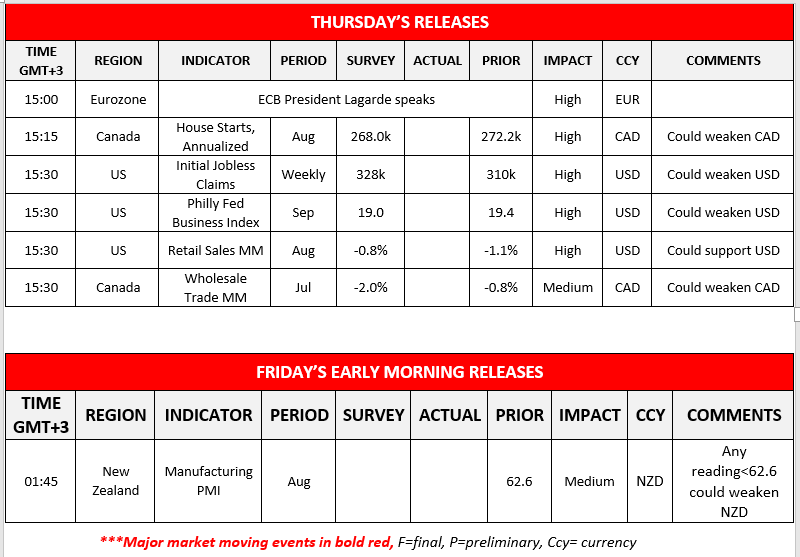 During today’s late European session, we note the planned speech of ECB President Lagarde and a bit later we get from Canada the number of House starts for August and the wholesale trade for July, while from the US we get the weekly initial jobless claims, the Philly Fed Business index for September and the Retail sales growth rate for August. During Friday’s Asian session we get New Zealand’s Manufacturing PMI for August.