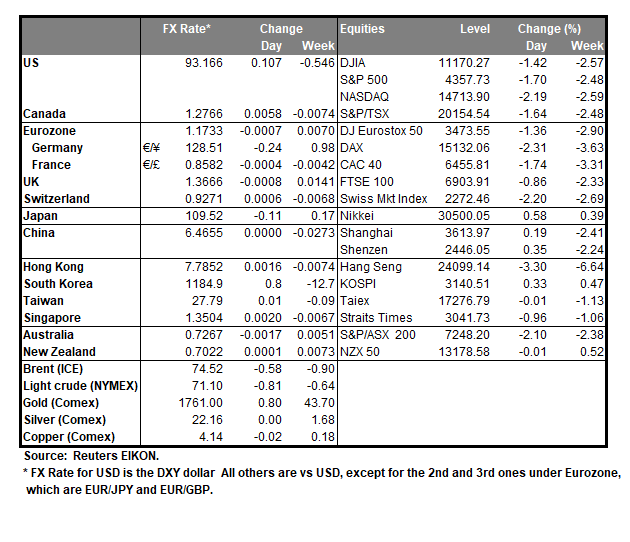 European and US stockmarkets retreated considerably yesterday as worries about a possible collapse of China’s mega developer Evergrande tended to intensify, especially for a possible contagion. It’s characteristic that all three major US indexes retreated with Dow Jones and S&P 500 leading the way since their last highs early September. It should be noted that Evergrande is considered to be one of the largest property Developers in China and has more than $300 billion in liabilities, and most analysts expect the developer to default. A rescue with an intervention by the Chinese government could be possible yet for the time being does not seem probable and the risk of defaulting rises as two major interest payments are due in the following days. The bearish sentiment intensified for the US stockmarkets as the risk factor increased due to US Congress failure to reach a deal about raising the US debt ceiling, thus risking the US government defaulting by mid-October. Should there be any signs of the Evergrande issue being containable, we may see the rebound of the US stockmarkets extending and vice versa.