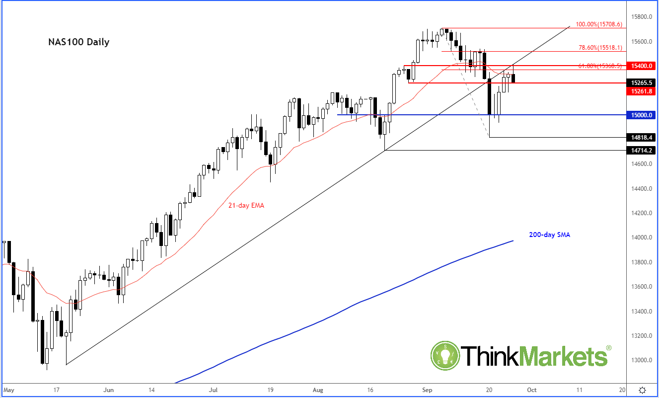 If yields climb higher, this could weigh especially on the overstretched growth stocks in the technology sector, which have low dividend yields. Investors might prefer the relative safety of government debt and fixed coupon payments than buying severely overvalued stocks, just as the Fed starts to reduce the pace of its asset purchases. Indeed, the Nasdaq 100 has started to turn lower again, finding resistance from the backside of the broken trend line and former support area around the 15300 to 15400 area: