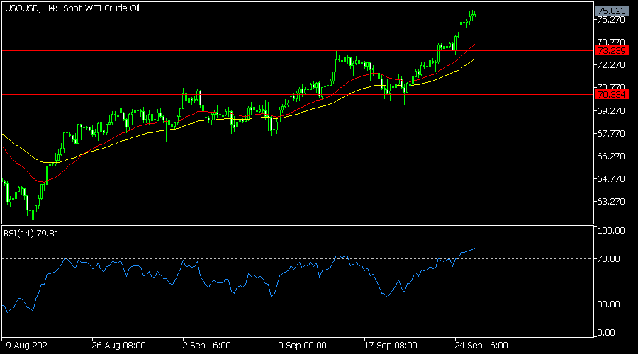 The XTIUSD rocketed higher in the overnight session as investors remained optimistic about demand. It rose to a high of 75.76, which was the highest level in three years. On the four-hour chart, the pair managed to move above the key resistance level at 75.0. It is also slightly above the short and longer-term moving averages. The price is also along the upper side of the Bollinger Bands. Therefore, the pair will likely keep rising as bulls target the next key resistance at 77.