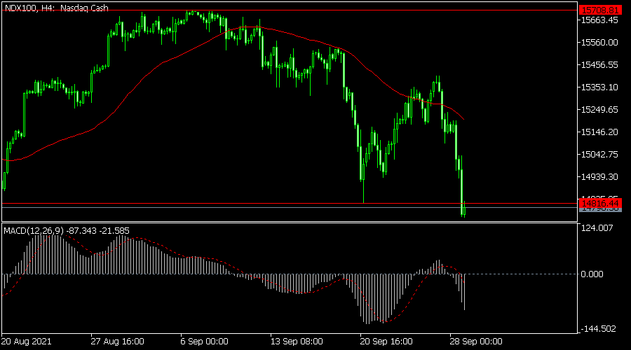The Nasdaq 100 index tumbled sharply as the sell-off of technology stocks continued. The index declined to a low of $14,470, which was a few points below last week’s low of $14,815. On the four-hour chart, the index has dropped below the short and long term moving averages. It has also moved below the lower side of the bearish flag pattern while the MACD has declined to the lowest level since September 20. Therefore, the index will likely keep falling with the next key support being at $14,500.