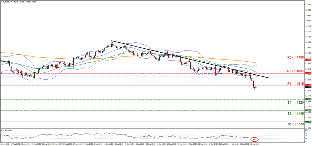 EUR/USD retreated further yesterday breaking the 1.1615 (R1) support line, now turned to resistance. We tend to maintain a bearish sentiment for the EUR/USD given that the pairs’ RSI indicator below our 4-hour chart is below the reading of 30, albeit that may also be signalling that the pair is oversold and a correction higher could be performed. Should the selling interest be extended we may see the pair aim if not break the 1.1520 (S1) support line, while should a correction higher take place we may see EUR/USD breaking the 1.1615 (R1) line, paving the way for the 1.1695 (R2) level.