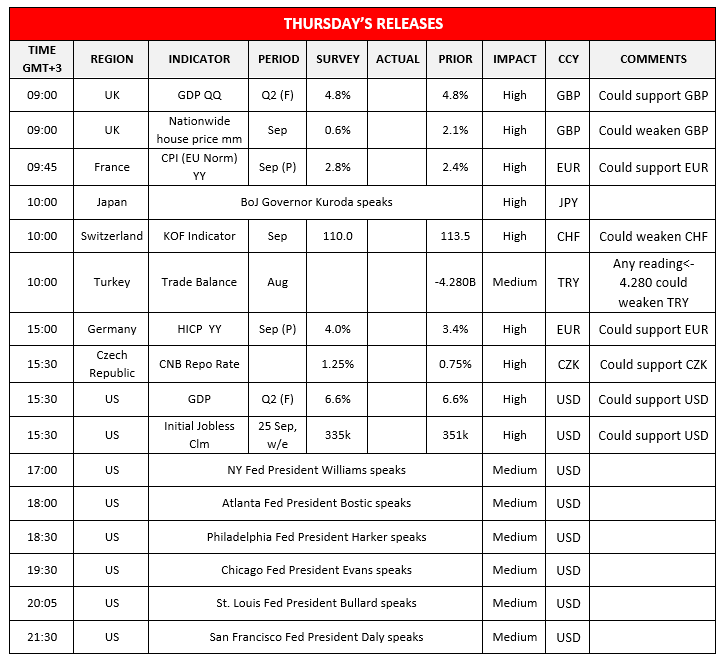 Today during the European session, we note UK’s GDP rates for Q2, UK’s Nationwide house prices for September, Frances’ and Germany’s preliminary HICP rates for September, Switzerland’s KOF indicator for September and Turkey’s Trade Balance for August. In the American session, we get from the Czech Republic CNB’s interest rate decision and from the US the final GDP rate for Q2 and the weekly initial jobless claims figure, while a number of Fed policymakers is scheduled to speak. During tomorrow’s Asian session we note the release of Japan’s Tankan indicators for Q3.