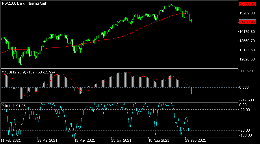 The Nasdaq 100 index declined to a low of $14,680, which is substantially below the all-time high of $15,708. On the daily chart, the index moved below the 25-day moving average. The MACD managed to move below the neutral level. The Williams %R has also declined to the oversold level. Therefore, the index will likely keep falling as bears target the next key support at $14,500.