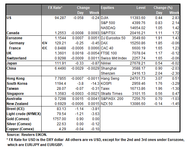CAD seems to be strengthening against the USD. Yet CAD traders, could be focusing on the release of the Canadian employment data but mixed signals about the Canadian employment market could be sent. On the one hand, the unemployment rate is expected to drop further which could be bullish for the CAD. On the other hand, the employment change figure is expected to retreat which could weaken CAD as it could imply some slack in the recovery of the Canadian employment market. It should be noted that BoC governor Macklem yesterday in his statements highlighted that the inflationary pressures may be more persistent while the recovery of the Canadian economy may not be as smooth as expected. Also, WTI’s price was on the rise again yesterday and tended to provide support for the Loonie as also did the positive market sentiment which was created in the markets.