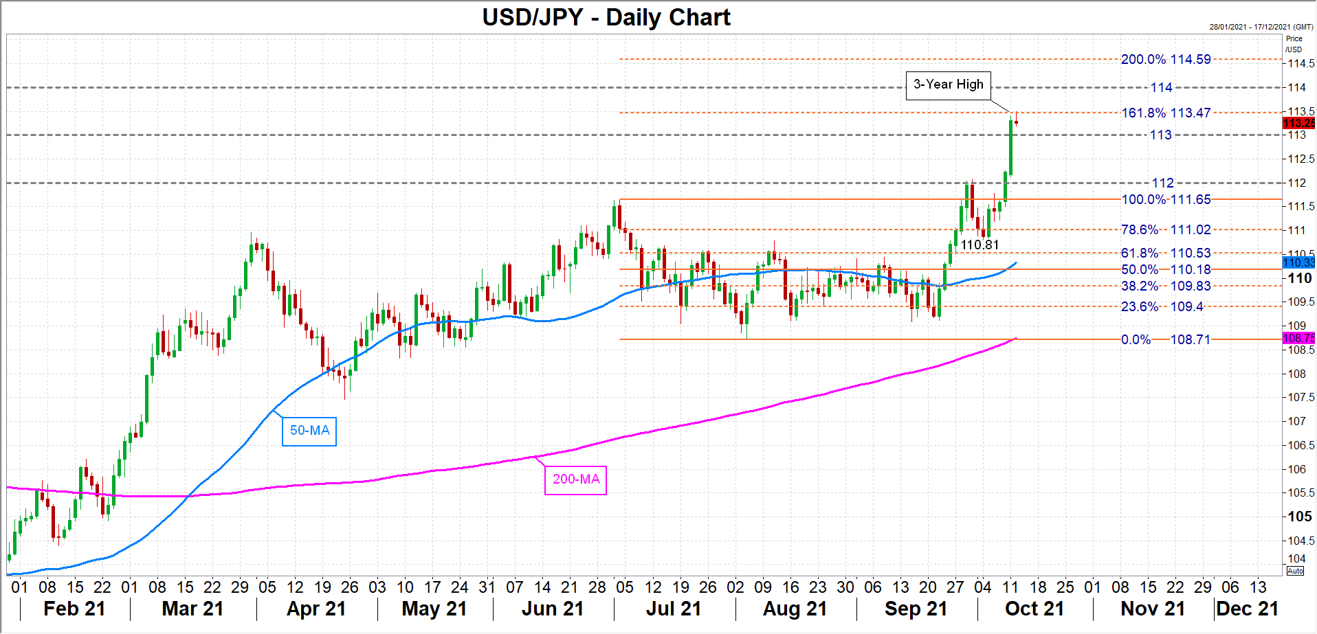 The US dollar was left unscathed from Friday’s disappointing payrolls numbers, with investors sticking firmly to their expectations of the Fed announcing tapering in November. Inflation data and the minutes of the September FOMC meeting due on Wednesday (12:30 and 18:00 GMT, respectively) may solidify those bets, eliminating any remaining doubts that the Fed will soon pull the plug on stimulus. However, given how strongly US yields have been rising lately, there is a risk of a pullback from any surprise softness in the CPI readings, which could in turn weigh on the dollar.