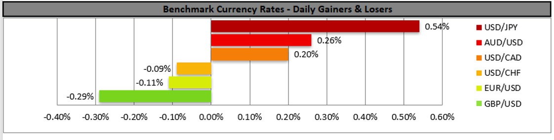 USD/JPY continued to rise yesterday breaking the 112.50 (S1) resistance line, now turned to support. We maintain a bullish outlook for the pair, yet today’s stabilisation in the Asian session seems to suggest otherwise. The RSI indicator below our 4-hour chart is still above the reading of 70, which confirms the bullish sentiment on the one hand, yet on the other may imply that the pair is overbought and could correct lower. Should the bulls maintain control over the pair’s direction we may see it breaking the 113.70 (R1) resistance line and aim for the 114.55 (R2) level. Should on the other hand a correction lower be preferred by the market and the bears take over, we may see the pair reversing course, breaking the 112.50 (S1) support line and aim for the 112.25 (S2) level.