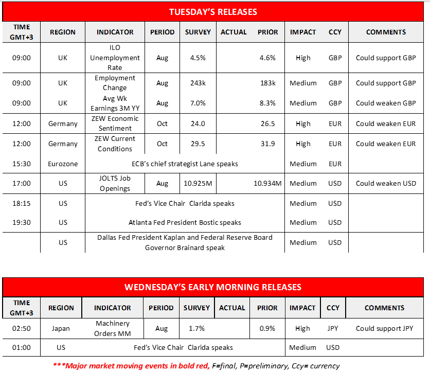 Today during the European session, we get from the UK, August’s employment data and from Germany, October’s ZEW indicators. In the American session, we get the US JOLTS Job openings for August. On the monetary front, we note ECB’s Lane, Fed’s Vice Chair Clarida, Atlanta Fed President Bostic, Dallas Fed President Kaplan and Federal Reserve Board Governor Brainard are scheduled to speak. Also during tomorrow’s Asian session we get Japans’ machinery orders for August.