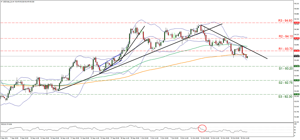 USD Index continued to drop yesterday clearly breaking the 93.70 (R1) support line, now turned to resistance. We maintain a bearish outlook for the index as long as it remains below the downward trendline incepted since the 13th of the month. The RSI indicator below our 4-hour chart is currently below the reading of 50 implying a slight advantage for the bears. Should the selling interest be continued we may see the index breaking the 93.20 (S1) support line and take aim for the 92.75 (S2) level. Should USD be in high demand the Index could reverse direction, break the prementioned downward trendline the 93.70 (R1) resistance line and aim for the 94.10 (R2) level.