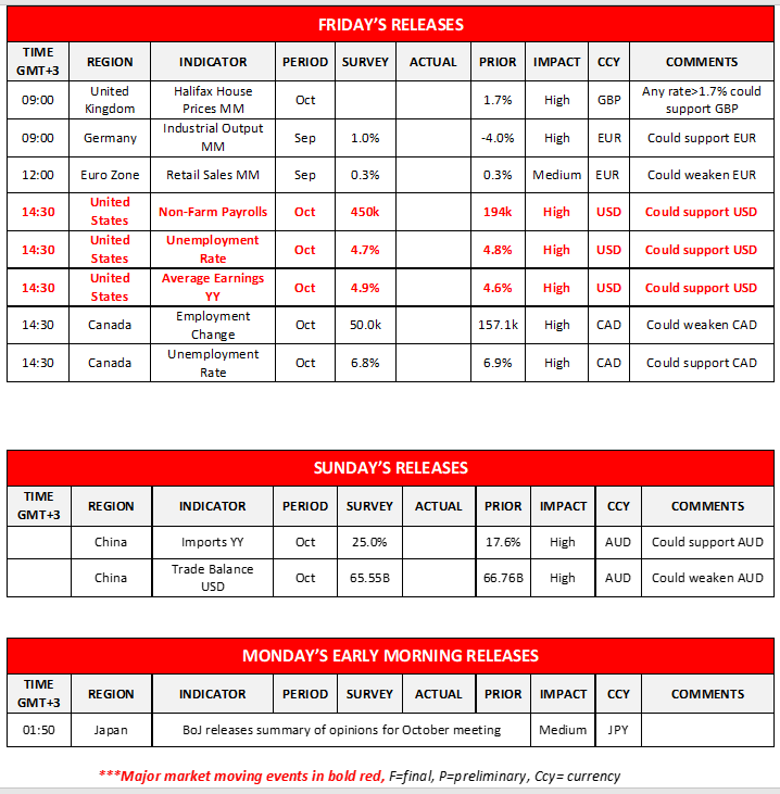 Today in the European session, we note the release of UK’s Halifax House prices for October, Germany’s industrial output for September and Eurozone’s retail sales growth rate for the same month. In the American session we note the release of the US employment report for October as well as the Canadian employment data for the same month. On Sunday we would also note the release of China’s trade data for October, while on Monday BoJ is to release the summary of opinions for October’s meeting.