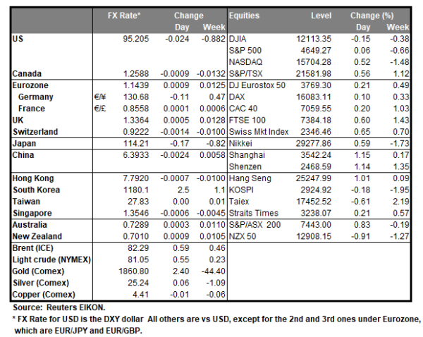 The USD continued to gain against a number of its counterparts yesterday in the aftermath of the release of October’s US CPI rates. Overall market mood remained unchanged also given that no high impact US financial data were released yesterday. On a fundamental level we note the thawing of tensions in the US-Sino relationships which started with the announcement of the collaboration of the two countries in an effort to reduce emissions. The issue though may continue as US President Biden and Chinese Leader Xi Jinping are scheduled to address leaders of the Pacific Rim late today and should the tensions in the relationships of the two countries ease further, we may see the USD experiencing some safe haven outflows. On the other hand, markets today may be more interested in the release of the preliminary US University of Michigan for November and the JOLTS job openings figure for September. On the monetary front we highlight the speech of New York Fed President Williams, and should he maintain the Fed’s usual narrative about the temporary nature of inflation we may also see the USD retreating somewhat due to the bank’s dovishness.