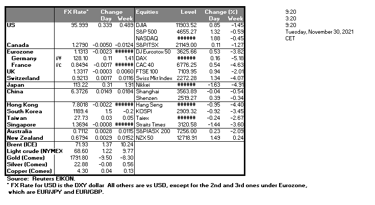 The markets seem to look through the new Omicron variant stabilising somewhat in a rebalancing act amidst lower volatility in the FX market, while the USD still remained rather soft yesterday and during today’s Asian session against its counterparts. Comments made by scientists that the symptoms of the Omicron variant seem to be mild tended to sooth market worries for the possible impact of the new variant of the pandemic on the recovery of the global economy. Today we note the release of the US consumer confidence indicator for November while on the monetary front we highlight the testimony of Fed Chairman Powell before the Senate and the speeches of New York Fed President Williams and Fed Vice Chair Clarida. Should the testimony and the speeches actually lean towards the hawkish side we may see the USD getting some support while also please note that US Treasury Secretary Yellen is also to testify before the Senate.