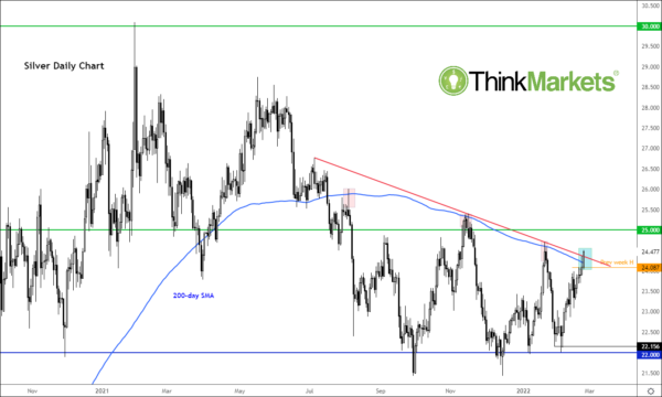 Gold had already been showing strength amid haven flows in recent days, extending its good run of form from the start of the month when inflation concerns intensified. Silver has also been rising along with gold, albeit a little stealthier as it didn’t break any major levels… until today: