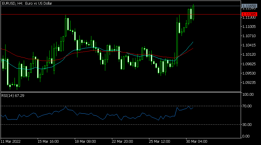 The EURUSD pair moved above the key resistance level at 1.1138, which was the highest level since March 17th. The price is slightly above the 50% Fibonacci retracement level. The bullish view is also being supported by the 25-day moving average while the Relative Strength Index (RSI) has been in an upward trend. Therefore, there is a possibility that it will keep rising today.